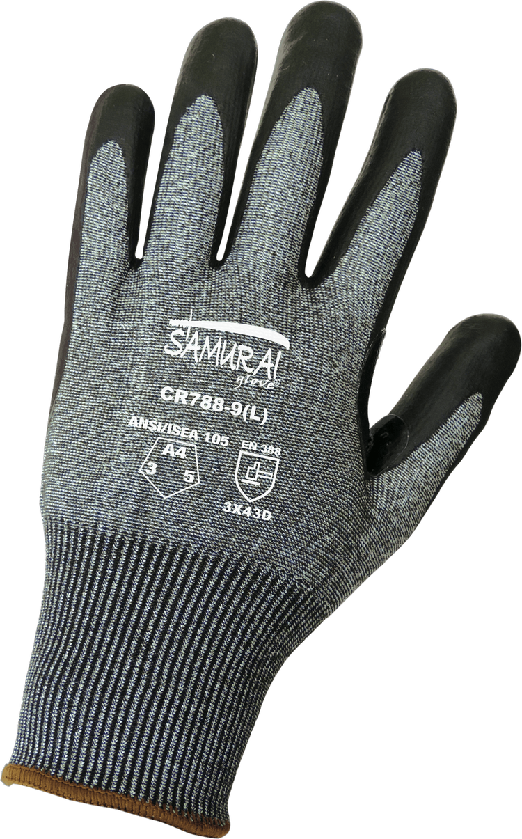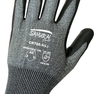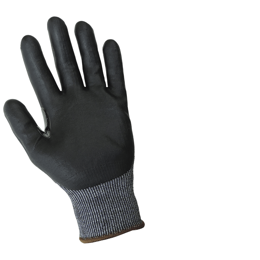 Guante liviano sin costuras es una excelente opción resistente a cortes con una cubierta de UHMWPE Tuffalene® sal y pimienta de calibre 18. La cubierta tiene una palma bañada en nitrilo negro con un acabado de espuma. Refuerzo entre índice y pulgar.